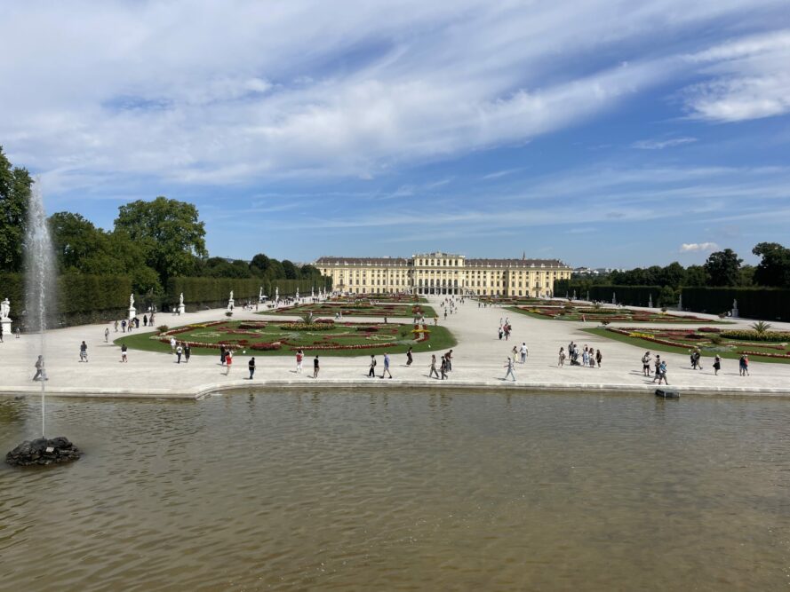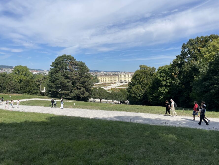 Ce matin, réveil motivé : la journée sera dédiée à l’impératrice Sissi. Vers 10h, je me rends au château de Schönbrunn pour visiter les appartements impériaux et arpenter les jardins. J’en profite pour pique-niquer en haut de la colline, face au château, avec Vienne en toile de fond. J’y passe une grande partie de la journée, entre balades, lecture et contemplation.
