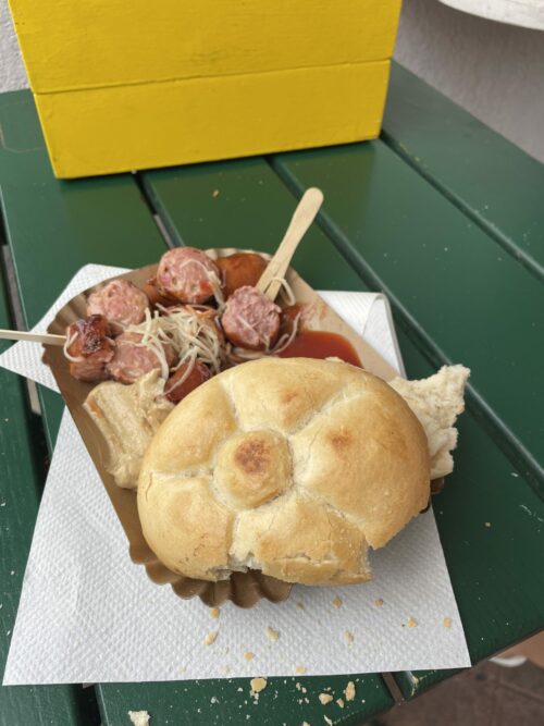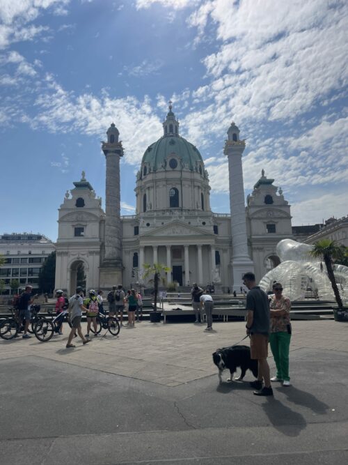 Nous poursuivons avec une balade au Naschmarkt, le marché le plus célèbre de la ville. Très touristique, certes, mais idéal pour goûter aux spécialités locales. À 14h, on s’arrête pour manger un Käsekrainer (saucisse au fromage). Pas très végétarien, mais typiquement autrichien. Et bien sûr, Marika ne pouvait pas repartir sans goûter une part de Sachertorte.