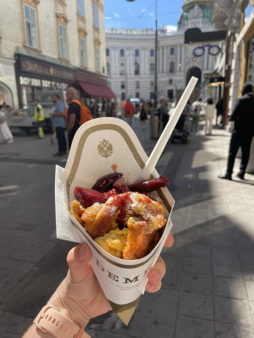 Pour garder mon rituel, vers 14h, je me suis offerte une pause sucrée avec un « Kaiserschmarrn », une spécialité locale. Selon la légende, c’était le dessert favori de François-Joseph, le mari de Sisi. Concrètement, c’est une sorte de crêpe épaisse, légère grâce aux blancs montés en neige, servie avec une confiture. Un délice !