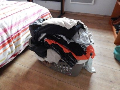 Puis, c’est parti, on tri les vêtements. Pour ne pas encombrer le lit, on fait étagère par étagère. On vide la première étagère sur le lit, puis on fait des piles de vêtements.