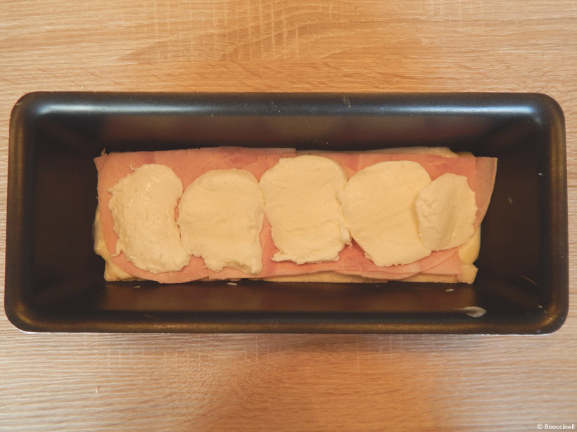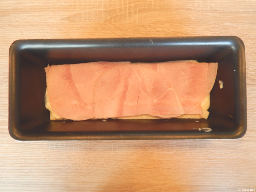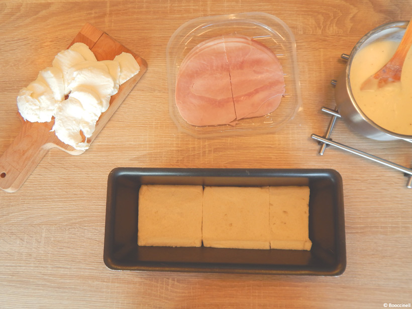 4.  Ensuite, déposez une première couche de pain dans le fond, la première couche a été préparé en amont, étape 1. Mettez une couche de béchamel, une couche de jambon (trois demi-tranches) et une couche de mozzarella. Puis, renouvelez 2 fois l’opération, du pain de mie jusqu’à la mozzarella. Après, tassez le tout pour que cela adhère bien au moule. Ensuite, terminez par le quatrième étage, en mettant une couche de pain de mie, une couche de béchamel et saupoudrez le tout de gruyère râpé.