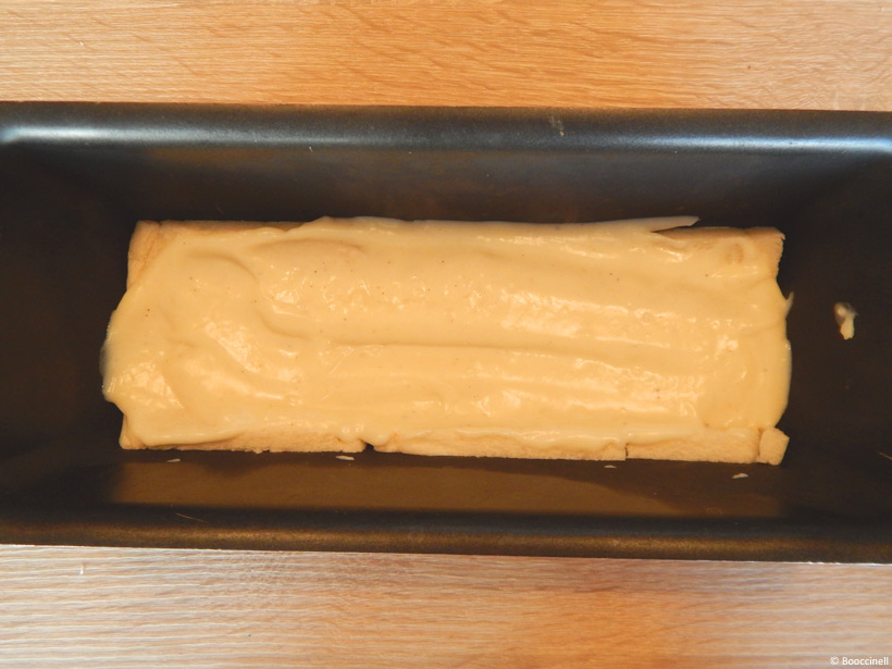 1. Tout d’abord, enlevez les croûtes du pain de mie, pour ma part, j’ai acheté du pain de mie sans croûte. Puis, coupez-les afin qu’elles s’adaptent à la taille de votre moule, un moule à cake convient parfaitement.